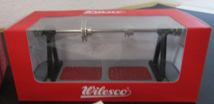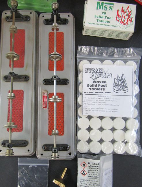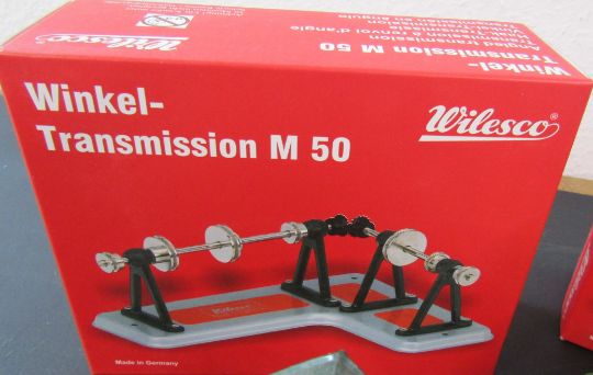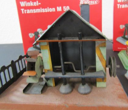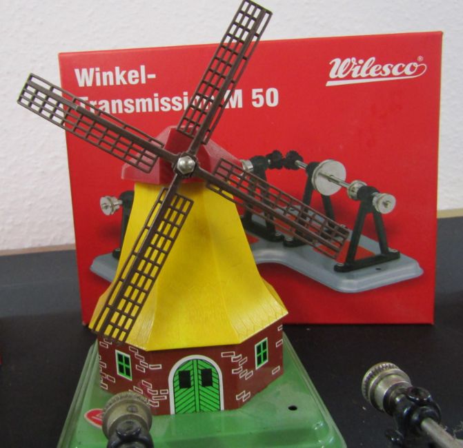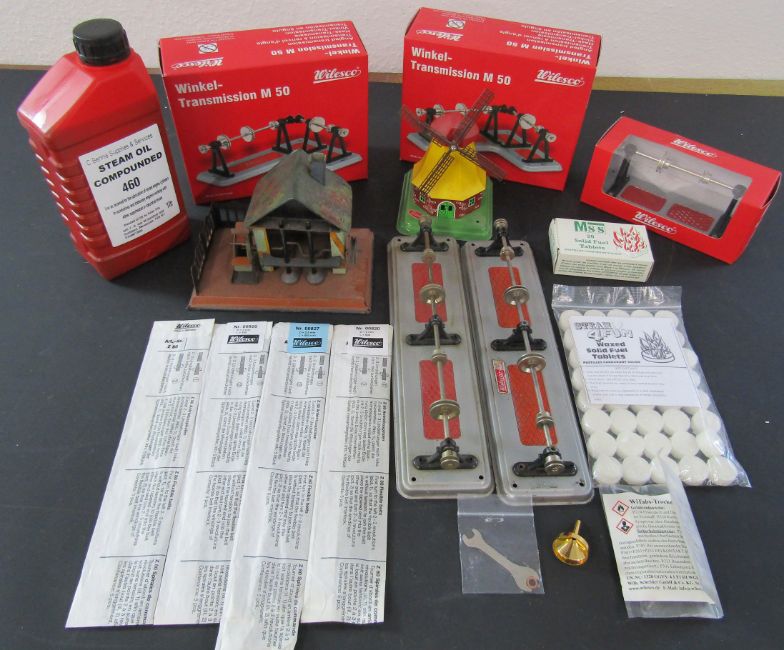Selection of steam engine transmissions including, 2 Wilesco winkel- M50s, a M55,  2 large Wilesco transmissions and a Fleischmann transmission, as well as 3 flexible belts, a Wilesco windmill, a steam powered tin plate water mill, solid fuel tablets and a large bottle of steam oil compounded