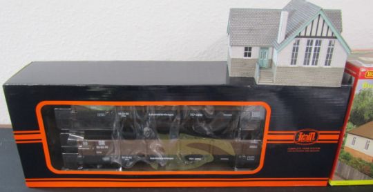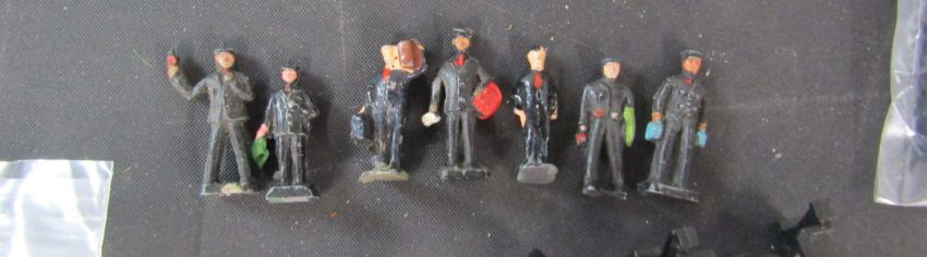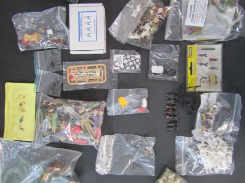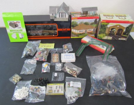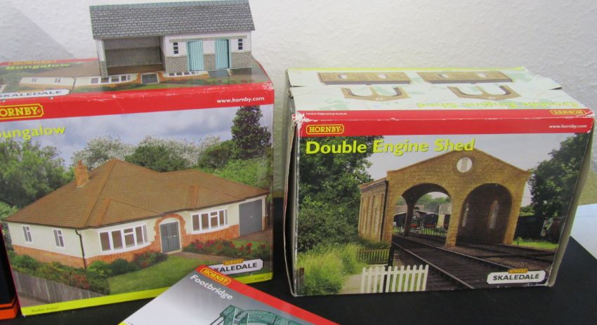 Boxed train no.757-5805, scale railway buildings including Hornby Skaledale bungalow, double engine shed and footbridge, and various assorted small scale railway scenery accessories, people, animals and flowers etc.