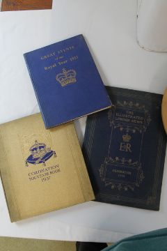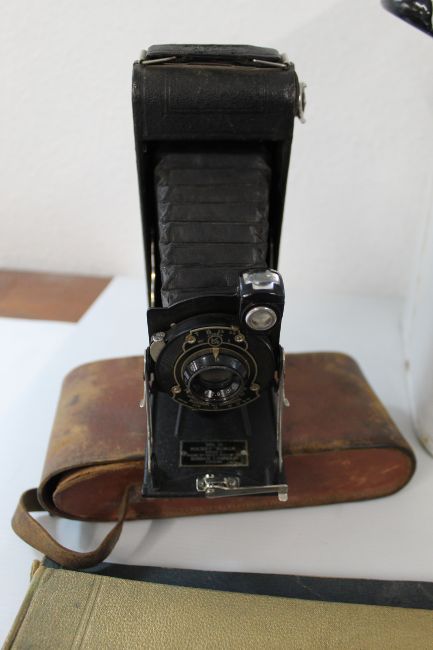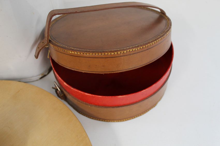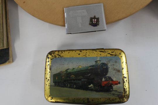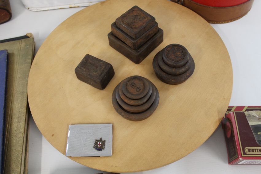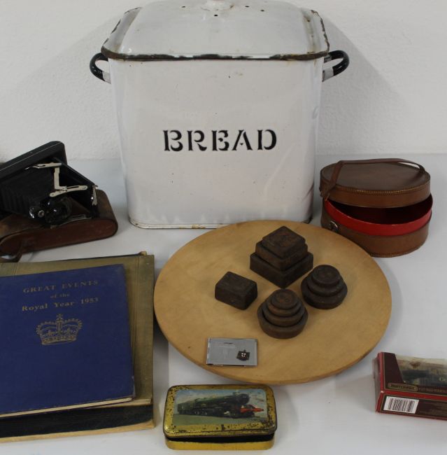 White enamel bread bin, leather collar box, model lorry, 11 x scale weights round and square, 3 x souvenir Coronation books, wooden lazy susan, metal tin with train design, Kodak Pocket 1a camera with case, metal stamp holder