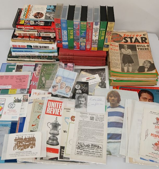 Quantity of sporting memorabilia including selection of football magazines -1950s / 60s Soccer Star (70) Charlie Buchan's Football Monthly (3), Goal (2) & World Cup Goal (1) The Boys Book of Soccer 1953-56, various books on sport, football VHS videos, souvenir programmes including Wimbledon 2011, Olympic Winter Games 1988, Rothmans Grand Prix Snooker 1988, Varsity Hockey 1937, Formula 1 World Championship, various football programmes including Grimsby Town v Wolves 1979, Glentoran Gazette, 2 x Tottenham 1960/61, Liverpool v Arsenal April 1980, England v Ireland (World Cup Qualifying Tournament) 1985 etc, Wembley FA Challenge Trophy Stewards ticket 1986, ticket various rugby league programmes - Final Tie Huddersfield v Wakefield Trinity May 1962, Great Britain v New Zealand October 1970, Featherstone Rovers v Dewsbury September 1967, Athletic New Football Annual 1945-46 (war issue), signatures of Notts 2nd XI CCC etc.