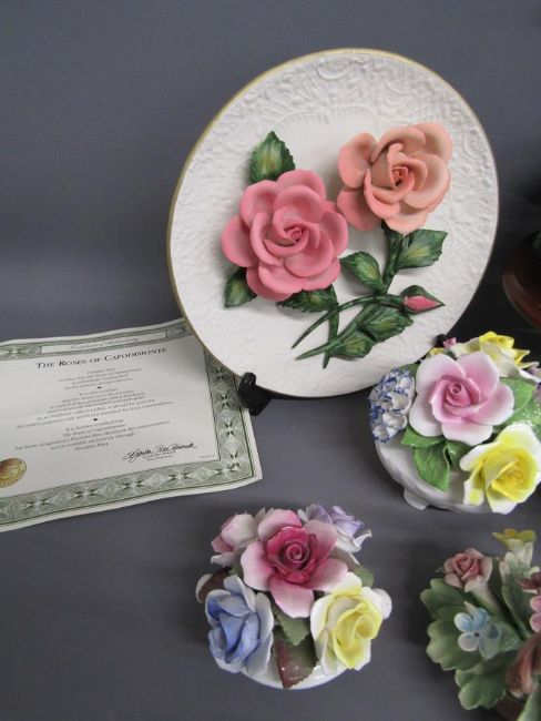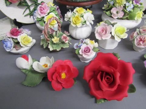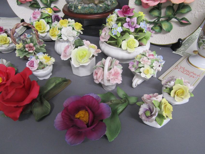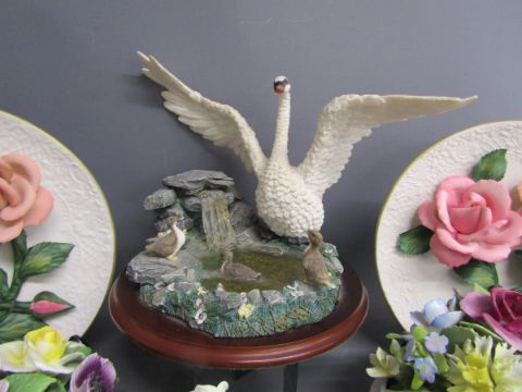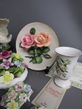 Franklin Mint Roses of Capodimonte plates & York and Lancaster roses, porcelain flower baskets includes Coalport, Royal Doulton, Amanda Florals, Royal Adderley, Leonardo Swan and ducks on pond figural scene, Franklin Redstart vase,