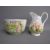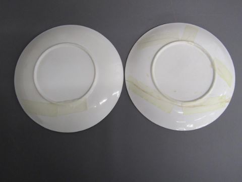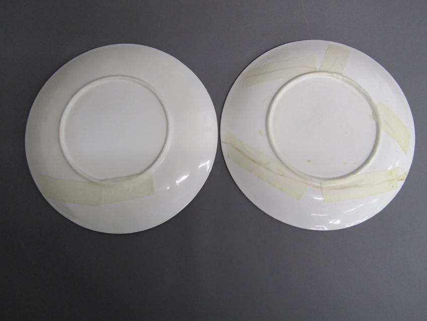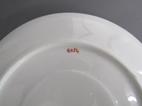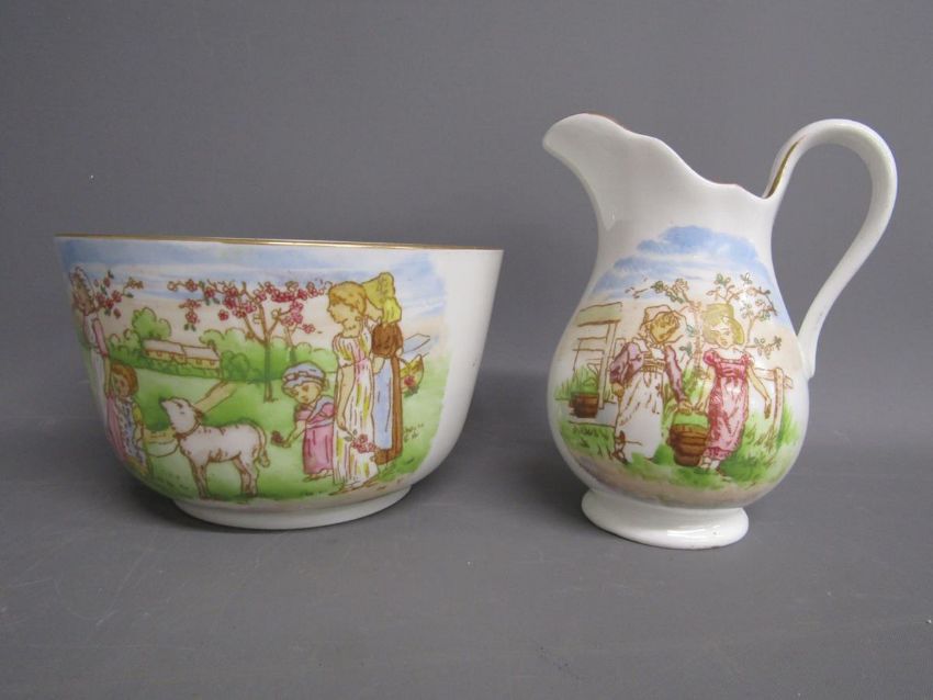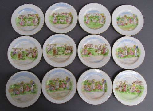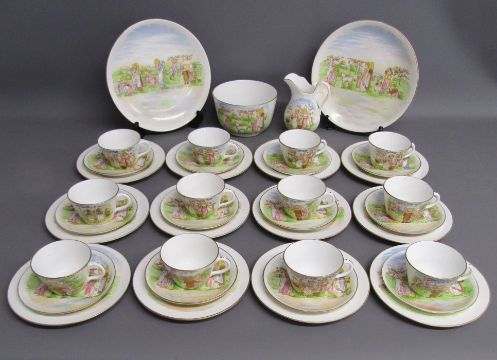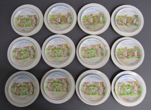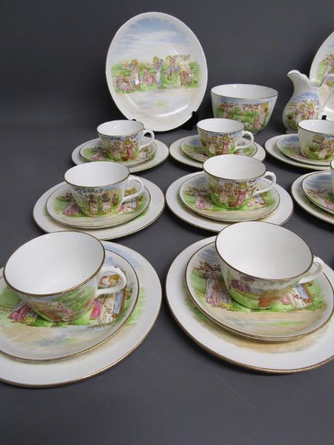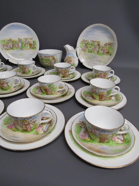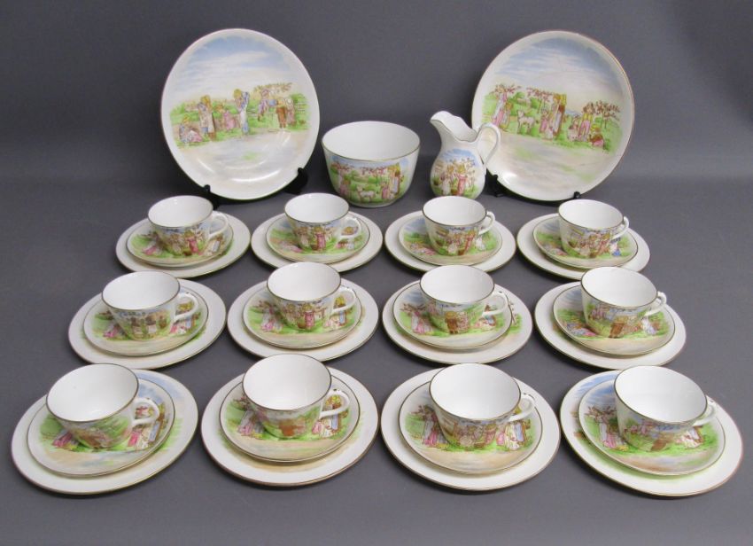 Tea set painted with Kate Greenaway style design of Victorian children playing on a farm includes cups, saucers, side plates, milk jug and sugar bowl also 2 cake plates both showing damage/taped repair - some pieces marked 6054