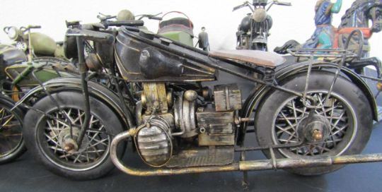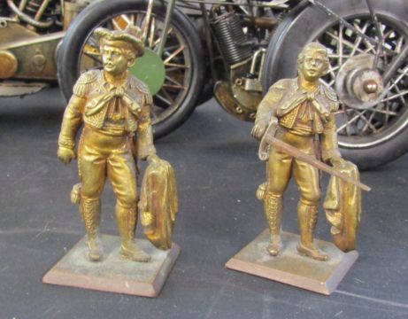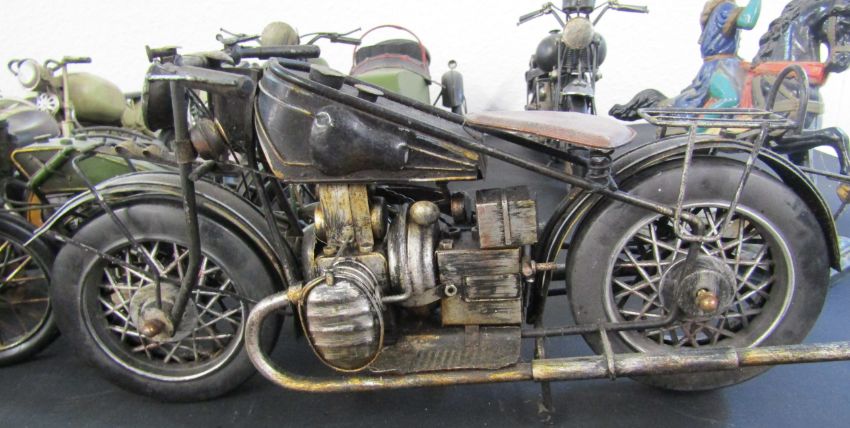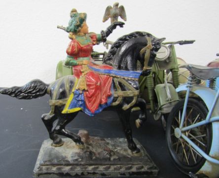 Collection of large metal motor bike models, 2 bronze figures and 2 metal figures on horse back