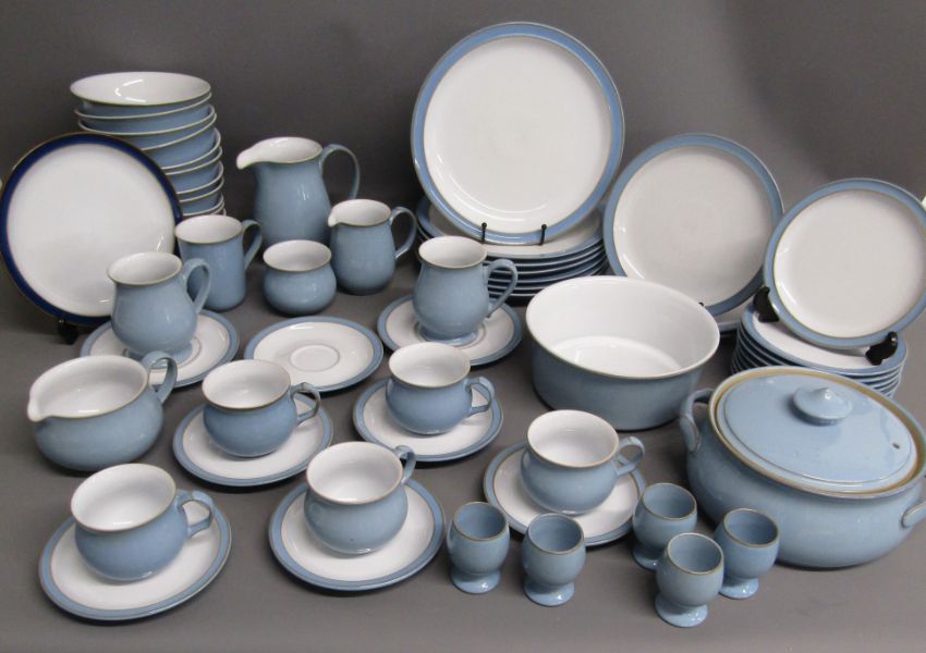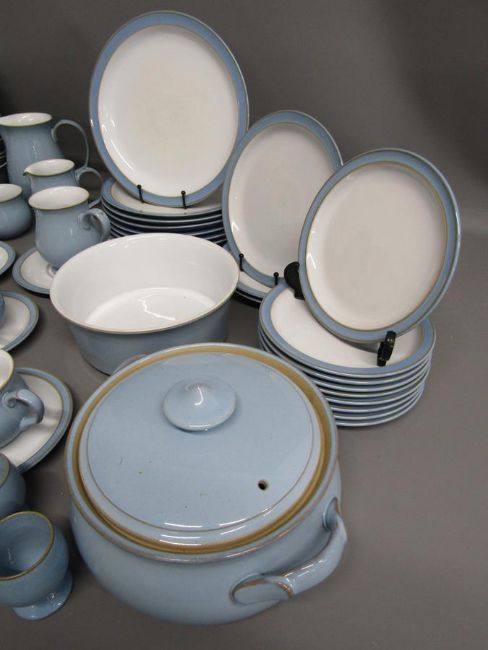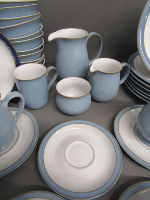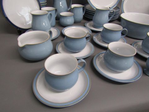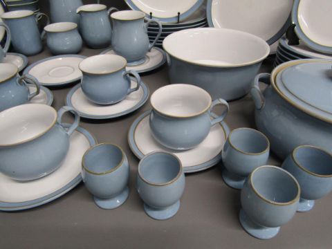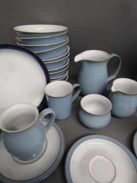 Denby Blue Colonial 7 dinner plates 26cm, 3 salad plates 21.5cm, 9 side plates 17.5cm, 11 bowls, serving dish, tureen, 5 egg cups, 6 small saucers, 5 tea cups, 2 large saucers, 3 mugs, 3 jugs, sugar bowl and 1 Colonial dark blue plate