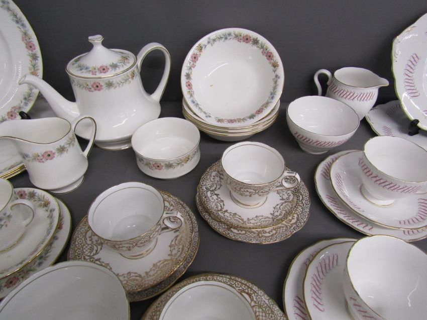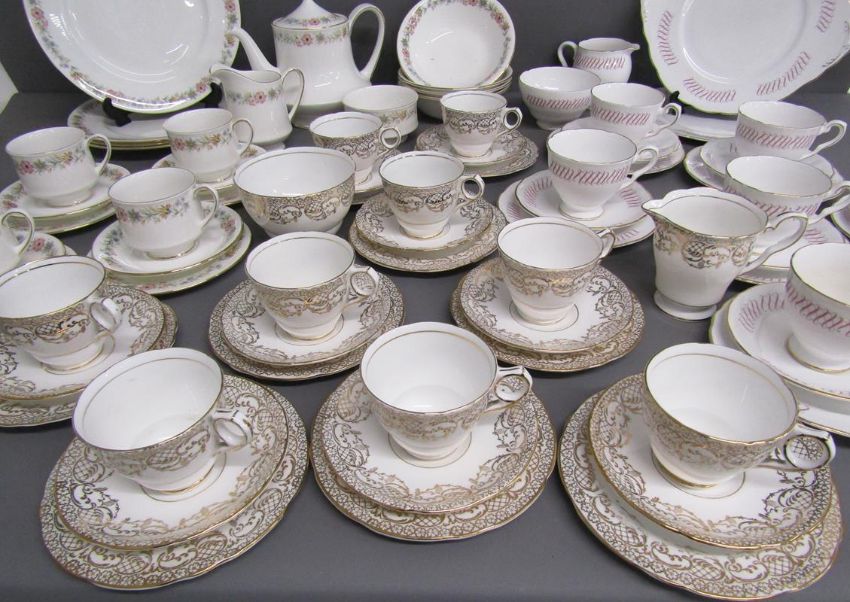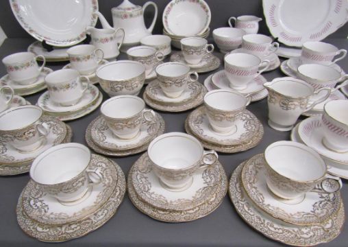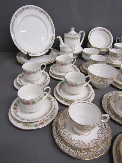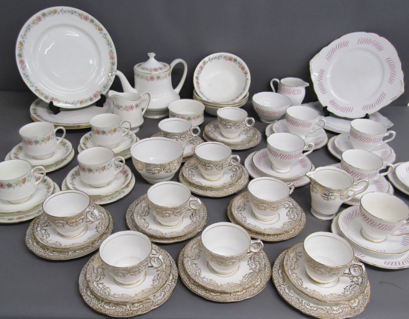 Tea sets includes - Royal Albert Belinda tea set with 4 bowls and 4 dinner plates - Royal Stafford 'Lyric' & gold design tea sets