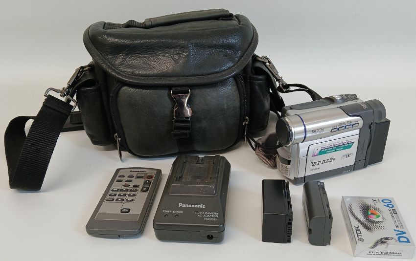 Panasonic digital video camera with spare cassette, remote control, spare batteries, carrying case & tripod